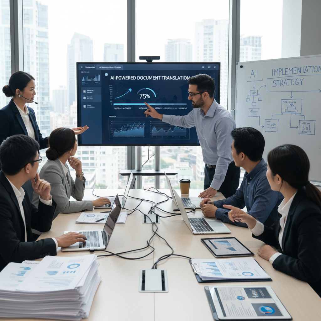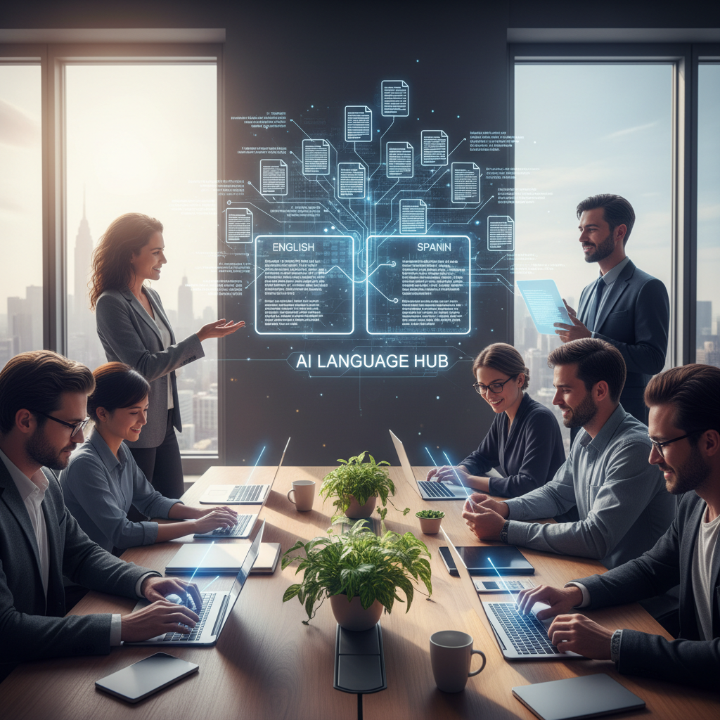 Zdjęcie: Nowoczesne biuro tłumaczeń AI, zespół analizuje cyfrowe dokumenty