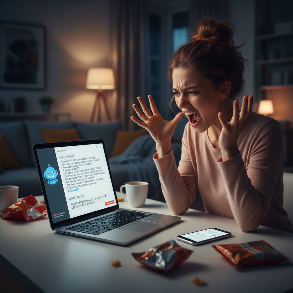 Użytkownik irytuje się podczas rozmowy z chatbotem, który nie rozumie jego pytań