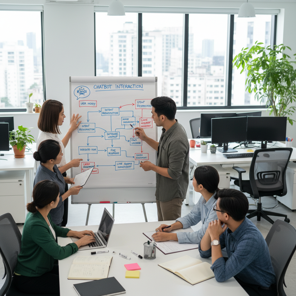 Zespół projektuje mapę procesów chatbota, planując jego funkcje i integracje