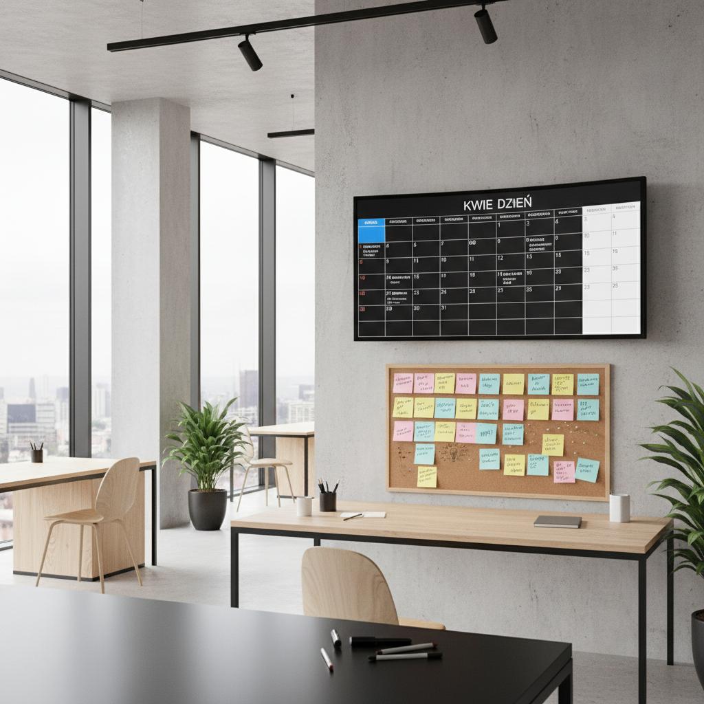 Nowoczesne biuro w Polsce z cyfrowym kalendarzem i papierowymi notatkami, pokazujące napięcie między tradycyjnymi a nowoczesnymi narzędziami zarządzania grafikami pracowników.