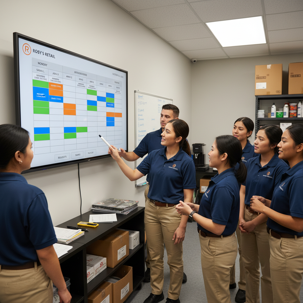 Pracownicy sklepu detalicznego w Polsce korzystający z cyfrowego narzędzia do zarządzania grafikiem zmianowym.