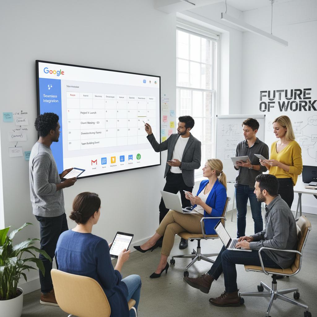 Zespół polskich pracowników korzystający z cyfrowego kalendarza z widoczną integracją Google Calendar.