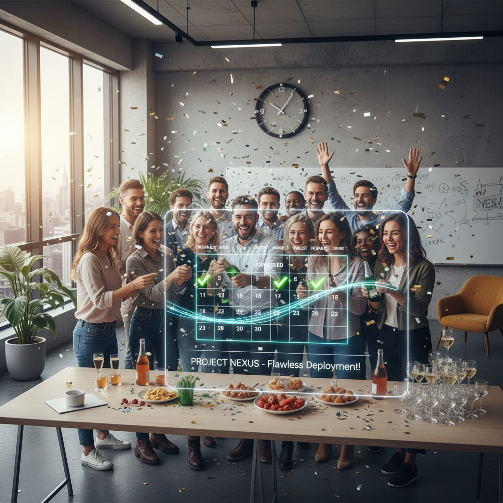 Zespół świętujący sukces wdrożenia automatycznego kalendarza — symbol zmiany i nowej jakości pracy.
