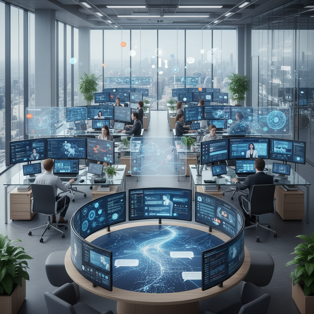 Nowoczesne biuro, gdzie chatboty integrują dane z różnych źródeł, tworząc spójną komunikację.